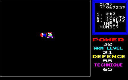 歩くとパワーが減って、食料を取ると増えるシステムでさ 警察に出会うとパワーが減って・・・ ランドセルを拾うと罠にはまってダメージ受けるんよー。 「簡易RPGみてーなゲーム(1986年1月に出たゲームよ。ドラクエ1が出た年と同じ年に出たゲーム)」 ![]() ![]() |